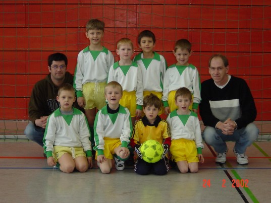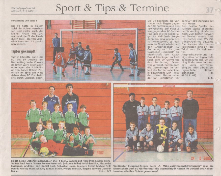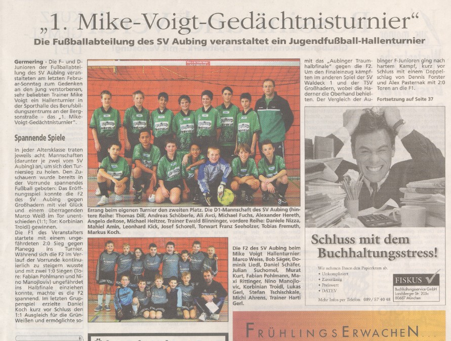 D1 des SV Aubing großzügiger Gastgeber Das war super und wir kommen nächstes Jahr gerne wieder der Mannschaftskapitän des SV Heimstetten sprach aus, was alle dachten. Das Mike-Voigt-Gedächtnisturnier der D1 des SV Aubing in der Sporthalle des Berufsbidungszentrums an der Bergsonstraße war ein voller Erfolg. Sportlich in jedem Fall, denn es wurde von den 11 12- jährigen z.T. hervorragender Fußball geboten; aber auch das Drumherum sprach alle an. In der Halle herrschte eine tolle Stimmung und der Kaffeebar mit hausgemachten Kuchen wurde rege zugesprochen. Auch ein Fehlalarm innerhalb der Schule, der die Münchner Berufsfeuerwehr anrücken ließ, wurde mit Humor genommen. Ein sportliches Schmankerl ließen sich die Veranstalter mit einer kleinen Einlage eines Spieles zweier Auswahlmannschaften aus den teilnehmenden Vereinen einfallen. Das Ergebnis war Nebensache, aber es war eine Augenweide wie die Spieler harmonierten, obwohl sie noch nie in dieser Formation miteinander gespielt hatten. Bravourös schlug sich die D2 des SV Aubing. In der Vorrunde unter Wert geschlagen unterlagen die Schützlinge von Coach Robert Pasternak im Spiel um Platz sieben dem FC Puchheim erst durch golden goal. Die D1 beendete die Vorrunde nach Siegen gegen den FC Puchheim und den TSV Gilching auf Platz 2. Nur gegen den SV Germering gab es eine Niederlage. Im Halbfinale gab es einen Sieg gegen den SV Heimstetten, sodaß man im Finale wieder auf den Angstgegner SV Germering traf. Als gute Gastgeber überließ die Mannschaft von Coach Ewald Blinninger im Endspiel dem SV Germering den Turniersieg. Dieser war verdient, hatten doch die Germeringer hatten im Verlauf des Turniers alle Spiele gewonnen. Den Pokal des dritten Platzes nahm der SV Heimstetten vor dem SV 1880 München mit nach Hause. Die D2 des SV Aubing trat an mit Fabrizio Triolo, Roman Pasternak, Martin Obermaier, Dennis Jaura, Daniel Zehetbauer, Michael Ettl, Maximilian Hinz, Alexander Fellner und Ender Dag und Andi Jaumann. Die D1 spielte mit Franz Seeholzer, Thomas Dill, Andreas Schöberle, Ali Avci, Michael Fuchs, Michael Heitzer, Alexander Hereth, Daniele Nizza, Mahiel Amin, Leonhard Kick, Josef Schorell, Markus Koch, Tobias Fremuth und Angelo de Rose. Den besten Spieler des Turniers stellte der SV Aubing mit Markus Koch. Zum besten Torwart des Turniers wurde Andreas Fischer vom TSV Gilching/Argelsried gewählt. Die Kanone des besten Torschützen ging an Toni Takiri vom SV Heimstetten. Er hat gute Chancen nächstes Jahr wiederzukommen....